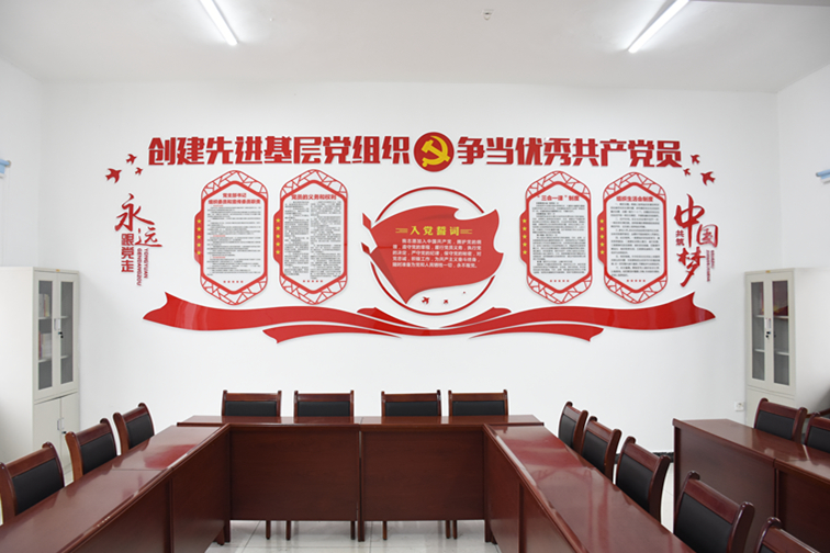 改造后的党员活动室布局规范简洁,在环境布置上,合理规划党旗、入党誓词、党员的义务和权利、“三会一课”制度、组织生活制度、党务公开宣传栏等上墙内容,文化墙以红色为基调,以党旗、党徽等标志性图案为背景,图文并茂、内容丰富;在资料管理方面,活动室配置专门书柜,收存党建类书籍及日常学习活动的存档资料,方便支部党员日常学习借阅。此外,党员活动室还配备了投影仪、电脑等设备,充分保障了党建学习教育需求,为支部党员提供了良好的活动阵地和学习环境。