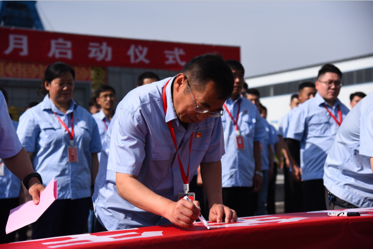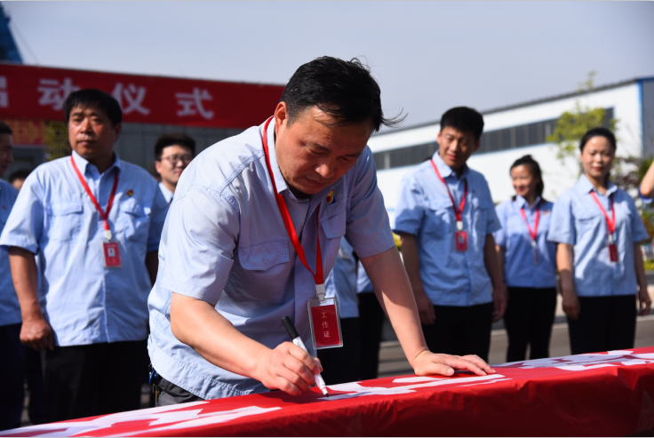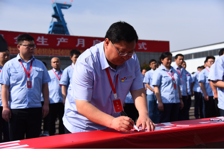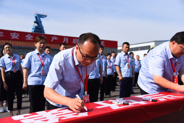 矿安全总监徐明武带头进行了“忠于职守、拒绝违章、坚守红线”安全宣誓,随后所有参与人员在印有“遵守安全生产法,当好第一责任人”的条幅上写下安全寄语,表明对安全生产的决心。