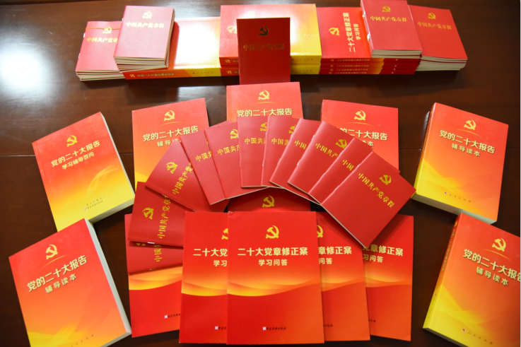 发放一批“党的二十大”宣传读物。为及时满足党员干部的学习需求,该矿线上订购了一批最新版的“党的二十大”读物,第一时间把党的二十大文献及学习辅导读本送到广大党员干部手中。发放的读物有《党的二十大报告辅导读本》《二十大党章修正案学习问答》《中国共产党章程》等,党员干部拿到读物如获珍宝,认真学习,在全矿范围内掀起了学习党的二十大精神热潮。