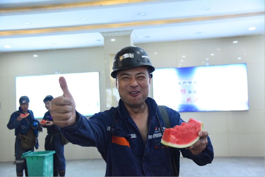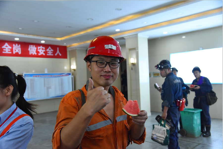 为确保活动的顺利开展,该矿提前做好了准备工作,6月22日早上7点,工作人员就将物品搬至井口等候室,一排排饮料、防暑药品、草帽和切好的西瓜,使活动现场充满了沁人的凉意。