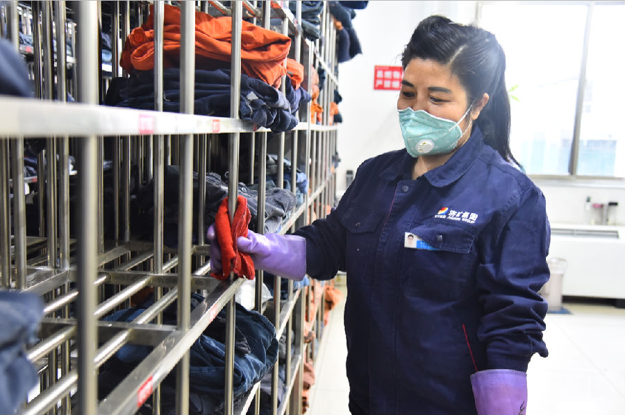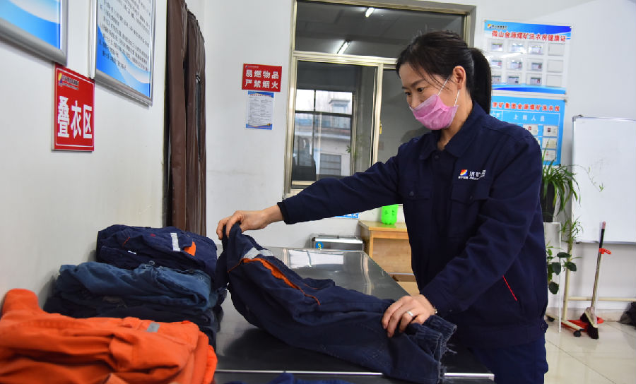 值守洗衣房三个姐妹和其他工友一样没有时间考虑其它的,工作需要我们,就要往前冲,她们撇下家里的孩子和年迈的父母,服从企业封闭式管理。在疫情防控期间,在班长化明娇的带领下采用多种消毒方式每日对女工澡堂和洗衣房所有设施和地面进行三次全方位灭菌、消毒工作;对工作服进行油污洗涤、含氯消毒液浸泡、高温消毒、烘干,对损坏的工作服及时缝补,衣服架使用消毒液内外擦拭,然后进行叠放按号放入衣架,全程戴口罩和手套。