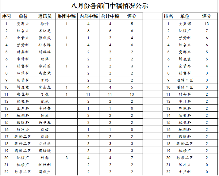 2020年8月份各单位投稿中稿情况公示